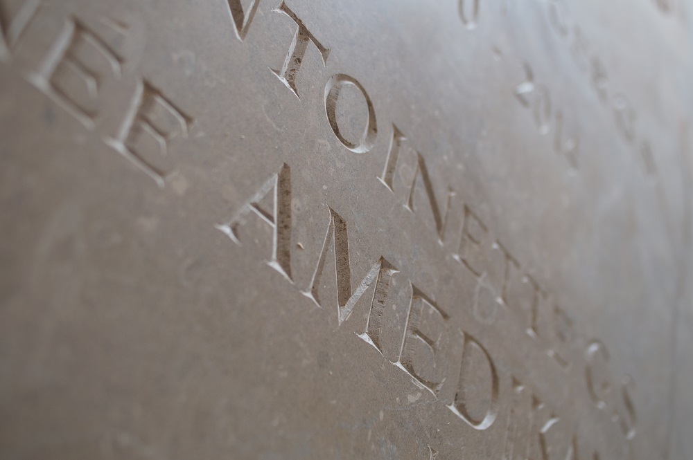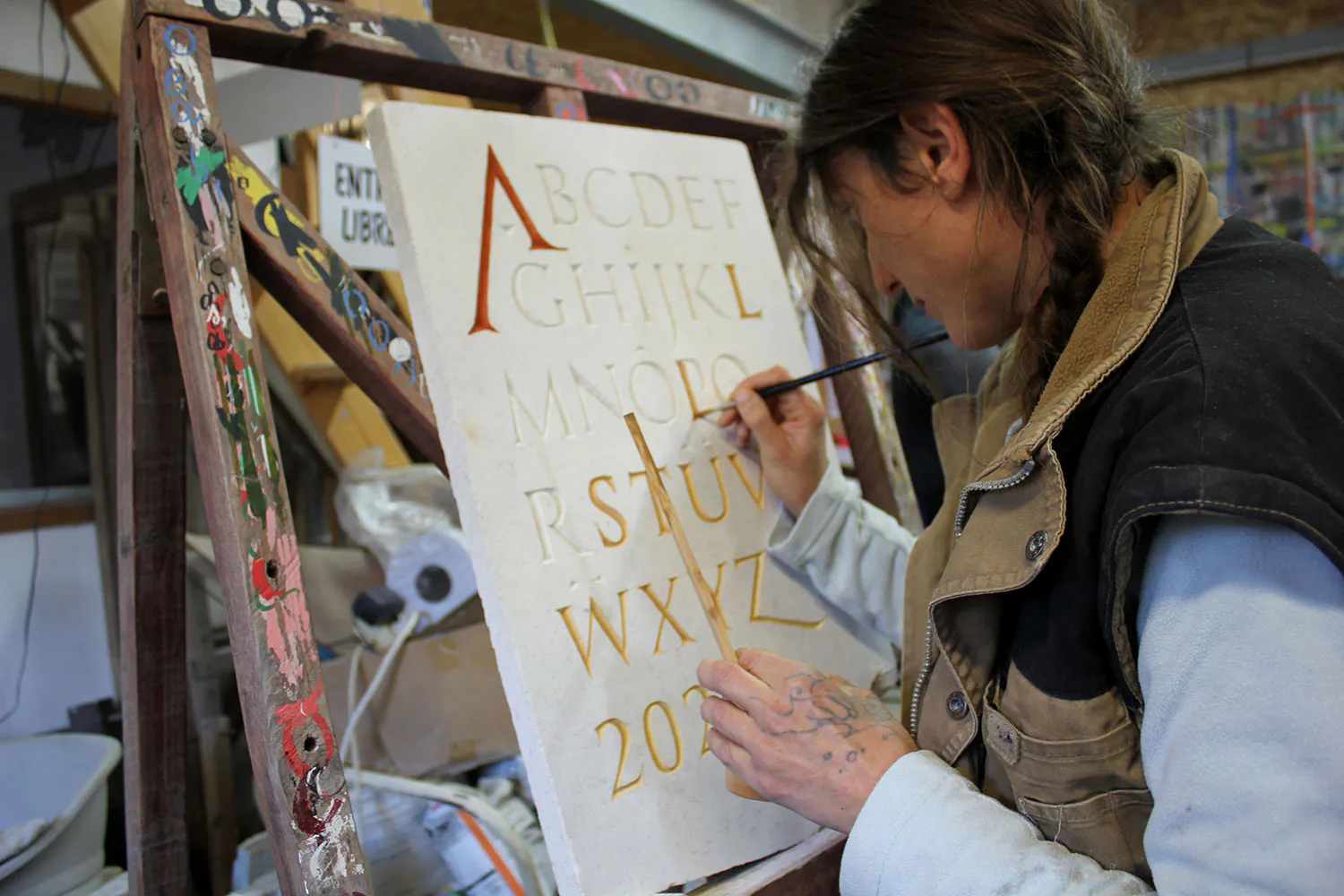 Vers, versets, noms, lieux, enseignes, dates et numéros… Pour se souvenir, indiquer. Permettre aux personnes de s’orienter, aux événements de ne pas tomber dans l’oubli. L’intention peut être soulignée par des ornements, le tracé soutenu par de la feuille d’or ou des pigments naturels. Face à la technique industrielle du sablage, la gravure propose un trait net et une inscription plus profonde dans le temps, changeante selon la lumière. Ensemble nous définiront le choix de la typographie, la disposition du lettrage et des motifs, le type de pierre et sa finition.